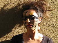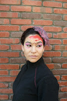 火鳳凰和金黃水晶做為額頭彩繪,利用京劇中的女伶為發想,做眼妝的設計。最後用裸色( Nude color )作為唇部色彩。由於眼粧和彩繪的部份顏色很強烈,所以在唇部我放棄了東方最常用的大紅色,改用裸色來呈現,一方面強調眼妝,不讓唇部色彩搶過鋒頭,二來裸色唇也讓整個妝從額頭開始,呈現一種越往下顏色越淡的漸層感覺。
