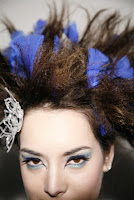 飾品用了藍色羽毛和我自己做的水晶珠花飾。老師的評語:360度都很好看的造型。因為我連後面都做的很工整。加上我擅長的畫眼頭,整個妝都亮起來了。