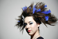 Melody是我今天的model,我的靈感來源是crown pigeon,一種常見於赤道地區的鴿類。利用玉米鬚夾把頭髮夾出類似與羽毛質感後,利用倒梳刮鬆,然後整個立起來用強力髮膠噴霧去做出直立的感覺。