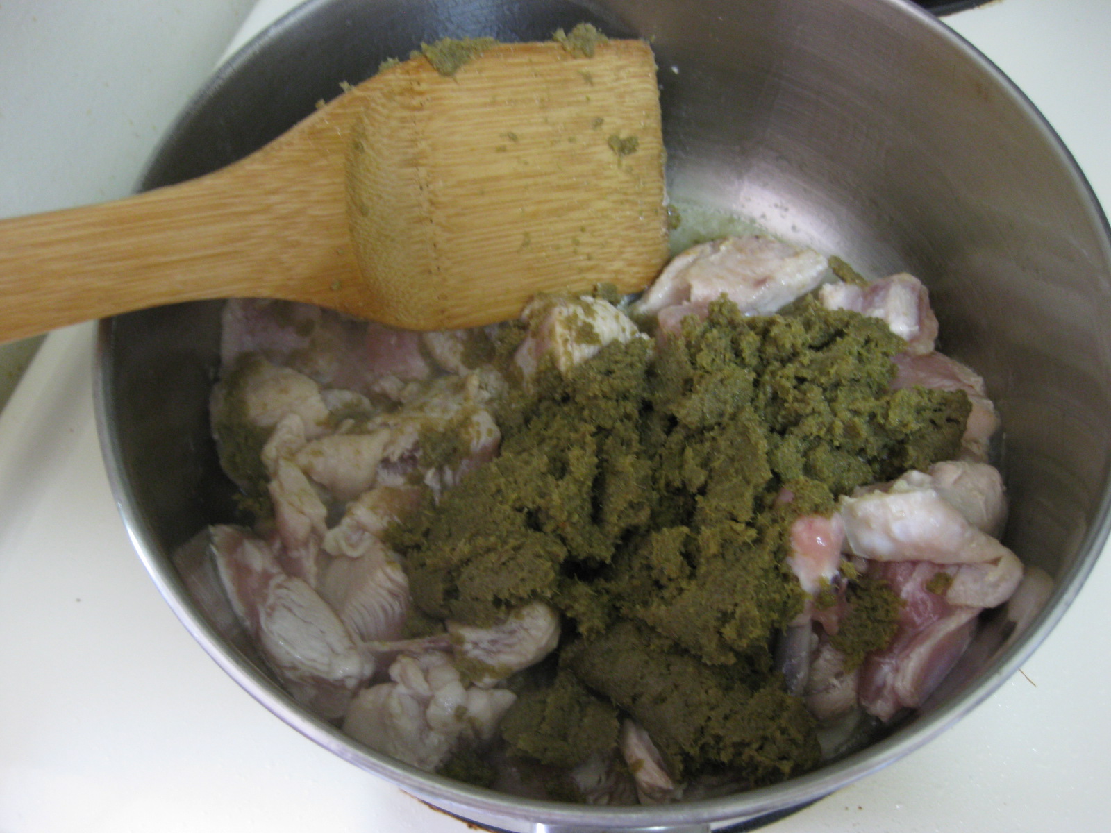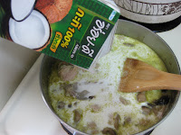 2、熱鍋後將泰式綠咖哩醬和一大匙椰奶加入鍋裡炒香。