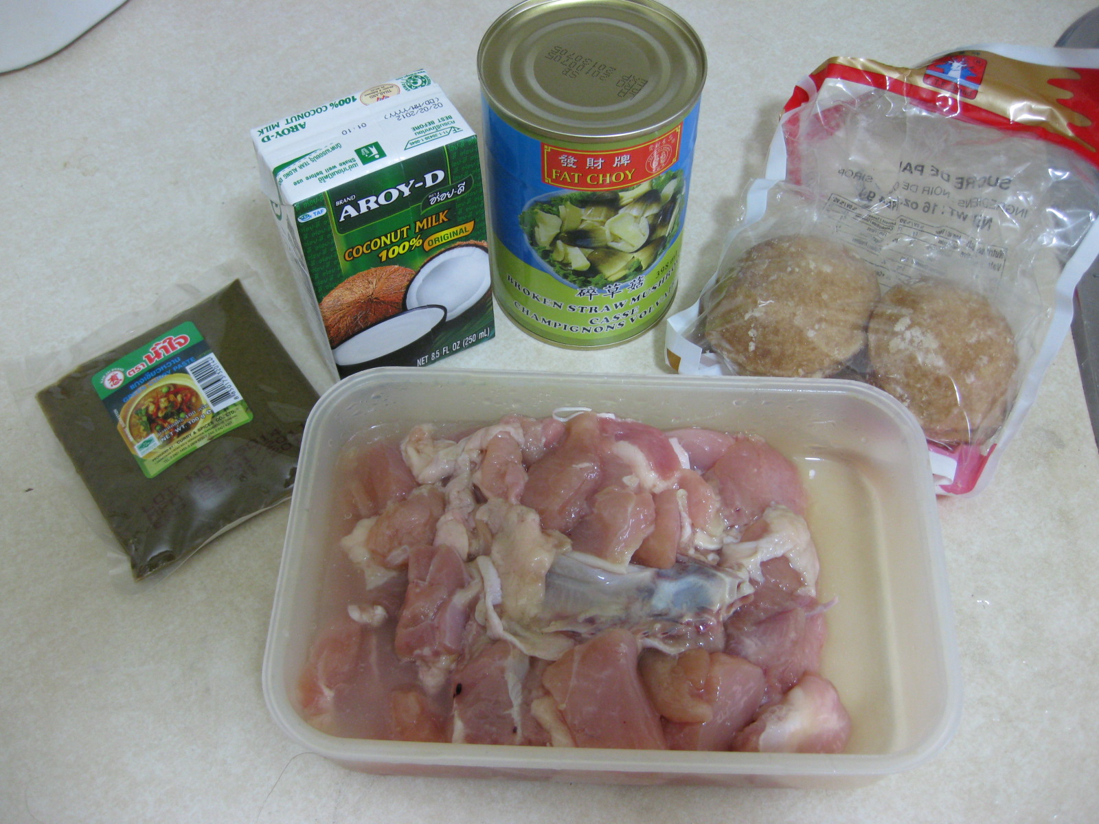 3、加入雞肉、草菇、水茄,再加入剩下的椰奶,全部拌勻炒香。加入250ml的水後燉煮,等水分充分揮發,鍋內湯汁呈現濃稠狀。