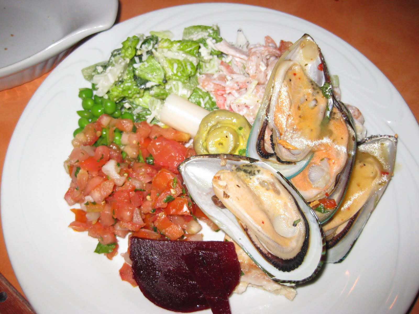 先跑到沙拉吧區弄了一盤蔬菜和淡菜,就好整以暇的等著各種肉類送上門。侍者會提著像長劍一樣的東西,上面串著烤好的肉類,在餐廳裡面穿梭。他們會逐桌詢問,遇到喜歡的項目,就可以請侍者當場切下所需的份量。 (右圖是炸香蕉、炸起士球)
