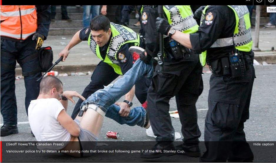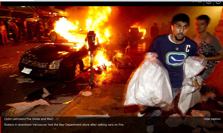 百貨公司被砸爛,有人趁黑進去洗劫。Coach店的玻璃全爛,看到有人進去狂拿包包。結果那些人被記者或者民眾拍到(大家手機現在都能錄影、拍照),傳到了溫哥華警局,現在除了當場逮捕的100人,警察局在電視台公告,請民眾寄拍到的犯罪影像給他們,以此抓人。