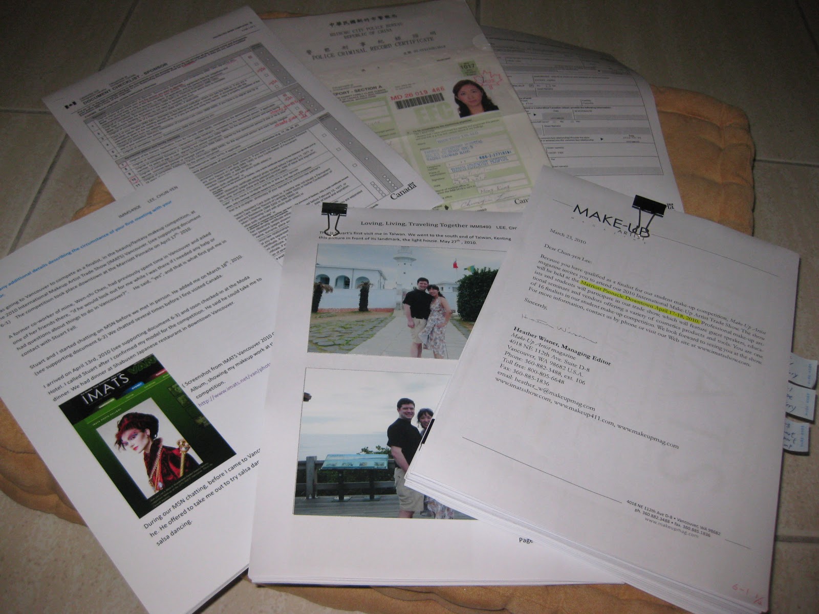 這份匯集所有交往過程圖文敘述和結婚證書等的超大文件包,終於在今晚我貼完最後一張婚禮照片後竣工。明天郵局一開門,我就要把這整包東西寄出去。量了一下厚度,竟然超過一吋厚!大個兒說他的文件也超過一吋厚了。不知道移民官真的看得完嗎?(真的一頁頁看嗎?)